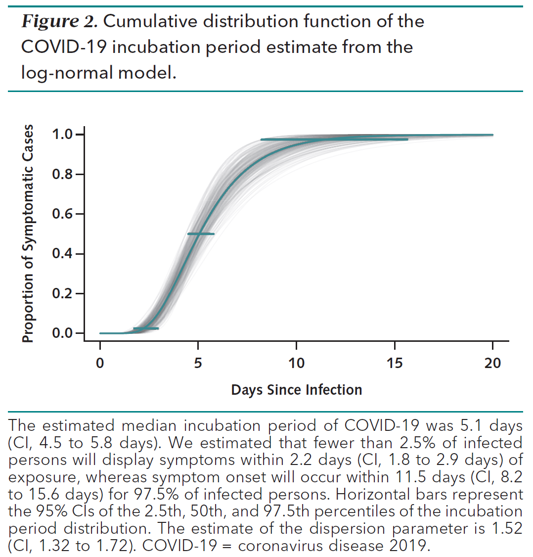 曝露がはっきりしている181例において、潜伏期間の中央値は5.1日(95%信頼区間2.2―11.5日)。(図)
